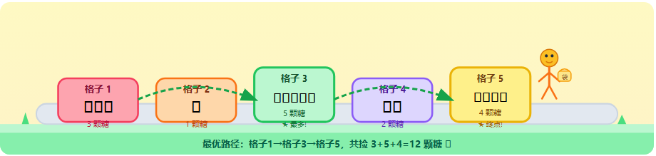 输出:12(路径:格子1→格子3→格子5,糖果 3+5+4=12)