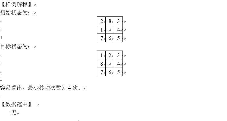 要求解的问题是:给出一种初始布局(初始状态)和目标布局(为了使题目简单,设目标状态为123804765),找到一种最少步骤的移动方法,实现从初始布局到目标布局的转变。