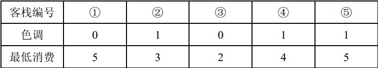 2人要住同样色调的客栈,所有可选的住宿方案包括:住客栈①③,②④,②⑤,④⑤,但是若选择住4、5号客栈的话,4、5号客栈之间的咖啡店的最低消费是4,而两人能承受的最低消费是3元,所以不满足要求。因此只有前3种方案可选。