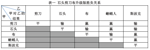 这五种手势的胜负关系如表一所示,表中列出的是甲对乙的游戏结果。