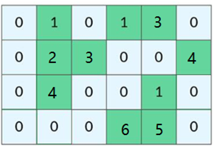 捕鱼的季节到了。捕鱼者在如下m*n的grid网格区域中捕鱼。网格中数字零表示是陆地,大于零的数字表示是一水域中鱼的数量。捕鱼能手总能寻找到最多鱼的水域处下水,一次就将相邻格子里的鱼全部捕捞上来。 相邻格子是指区域内上、下、左、右四个方向上相连的格子。
