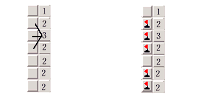 小明最近迷上了windows上的扫雷游戏 他研究了扫雷的策略,设计了一种只有两列的扫雷游戏:在 n行2列的方格棋盘上,左列某些方格内埋有地雷,而右列每个方格中都有一个数字(0~3),第I格的数字表示:左列第I-1、I、I+1格(即:上、中、下三格)中埋雷的总数。如下所示:左图是初始状态,右图是扫雷完成状态(插小旗的方格内有雷)。