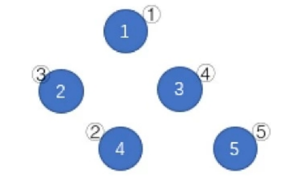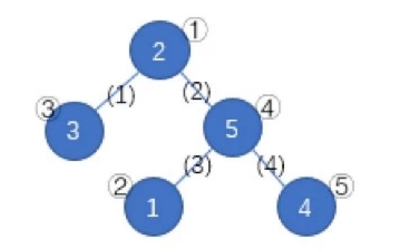 如上图,蓝圈中的数字 1∼5 一开始分别在结点②、①、③、⑤、④。按照 (1)(4)(3)(2) 的顺序删去所有边,树变为下图。按数字顺序得到的结点编号排列为①③④②⑤,该排列是所有可能的结果中字典序最小的。
