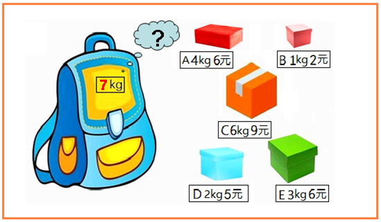 样例数据见上图。选B物品一件及D物品三件,装入背包重量为7 ,价值为17最大。