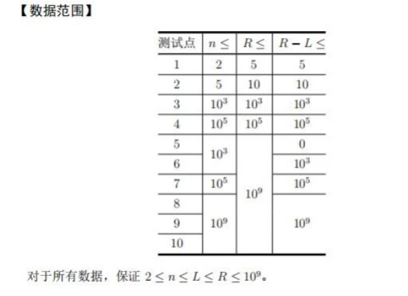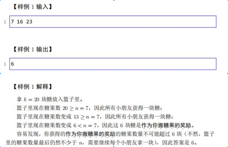 由于你只是个平平无奇的幼儿园小朋友,所以你的体力有限,至多只能拿 R块糖回去。但是拿的太少不够分的,所以你至少要拿 L块糖回去。保证 n ≤ L ≤ R 。也就是说,如果你拿了 k块糖,那么你需要保证 L ≤ k ≤ R 。如果你拿了 k 块糖,你将把这 k块糖放到篮子里,并要求大家按照如下方案分糖果:只要篮子里有不少于 n 块糖果,幼儿园的所有 n 个小朋友(包括你自己)都从篮子中拿走恰好一块糖,直到篮子里的糖数量少于 n 块。此时篮子里剩余的糖果均归你所有——这些糖果是作为你搬糖果的奖励。
