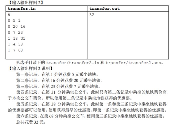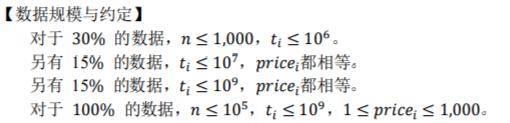 输入的第一行包含一个正整数。接下来的输入的第一行包含一个正整数n,代表乘车记录的数量。接下来的n行,每行包含3个整数,相邻两数之间以一个空格分隔。第i行的第1个整数代表第i条记录乘坐的交通工具,0代表地铁,1代表公交车; 第2个整数代表第i条记录乘车的票价pricei, ; 第三个整数代表第i条记录开始乘车的时间ti (距0时刻的分钟数)。