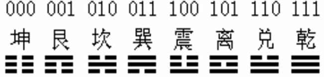 八卦是我国古代劳动人民表示事物自身变化的阴阳系统。用“一”代表阳,用“- -”代表阴,用三个这样的符号,组成八种形式,叫做八卦。将“一”看作数字1,将“- -”看作数字0,自下而上依次看做三位数,那么八卦与二进制数有如下的对应关系: