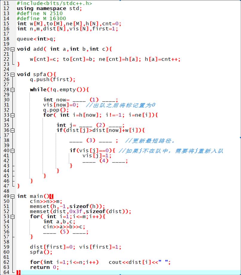 (3) A. dist[j]=dist[now]+w[now]; B. dist[j]= abs(dist[i]+w[now] )