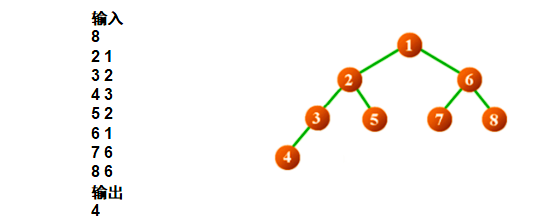 输入第一行包含一个正整数n,即树的结点数量(1<=n<=1000)。 接下来有n-1行,每行有两个正整数x,y,表示在x和y结点之间存在一条边。(1<=x,y<=n)输出描述:输出仅包含一个正整数,表示所需要的最短时间。
