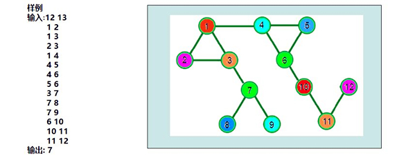千岛湖新建了星岛公园,以众多的桥连接各具特色的小岛而闻名。给你一张星岛公园的导游图,其中除了围绕小岛上的道路外便是一座座桥了。现在请你依据图论中求桥的方法,求出在这张导游图上共有多少座桥。样例图示如下: