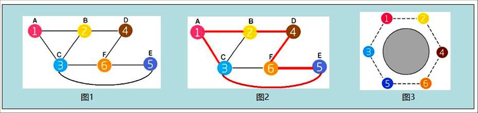 例如已知 A 会讲汉语和法语,B 会讲汉语、日语和俄语,C 会讲法语、日语和英语,D 会讲德语和俄语,E 会讲法语和英语,F 会讲法语、英语和德语。以下图示中无向图用数字替代字母表示了相同语言关联。图2红线所示一条字典序最小的序列。图3为圆桌安排示意。