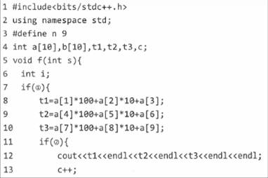 请完善下面的程序,将1-9个数字分别填入3x3的九宫格中,第一行的三个数字组成一个三位数。要使第二行的三位数是第一行的2倍,第三行的三位数是第一行的3倍,且每个格子里的数字都不能重复,现在要求输出所有的填充方案,以每种方案中的第一行组成的三位数升序输出。
