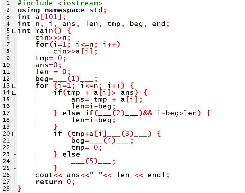 A. tmp=0 B. len++ C. beg=i D.tmp+=a[i]