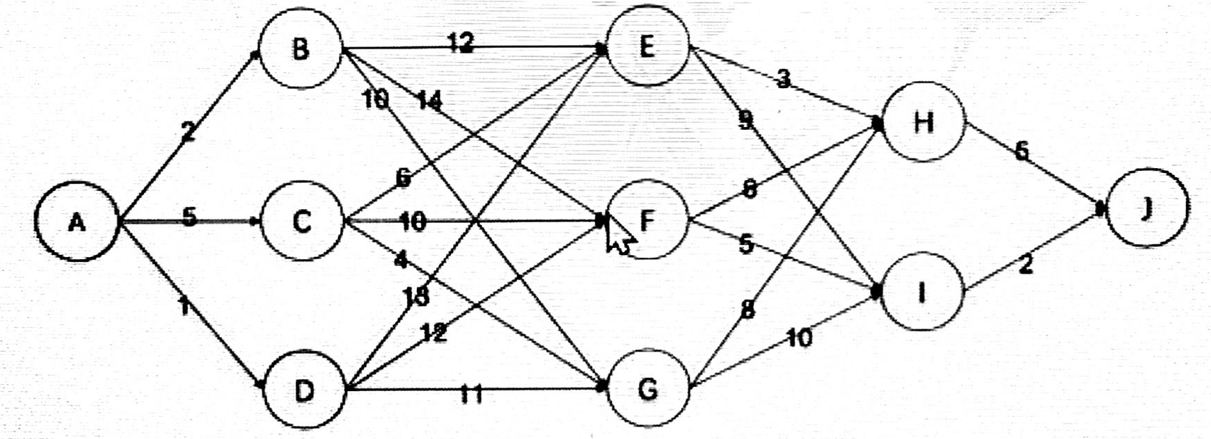 15.有如下的有向图,节点为A,B,⋯,J,其中每条边的长度都标在图中。则节点A到节点J的最短路径长度为()。