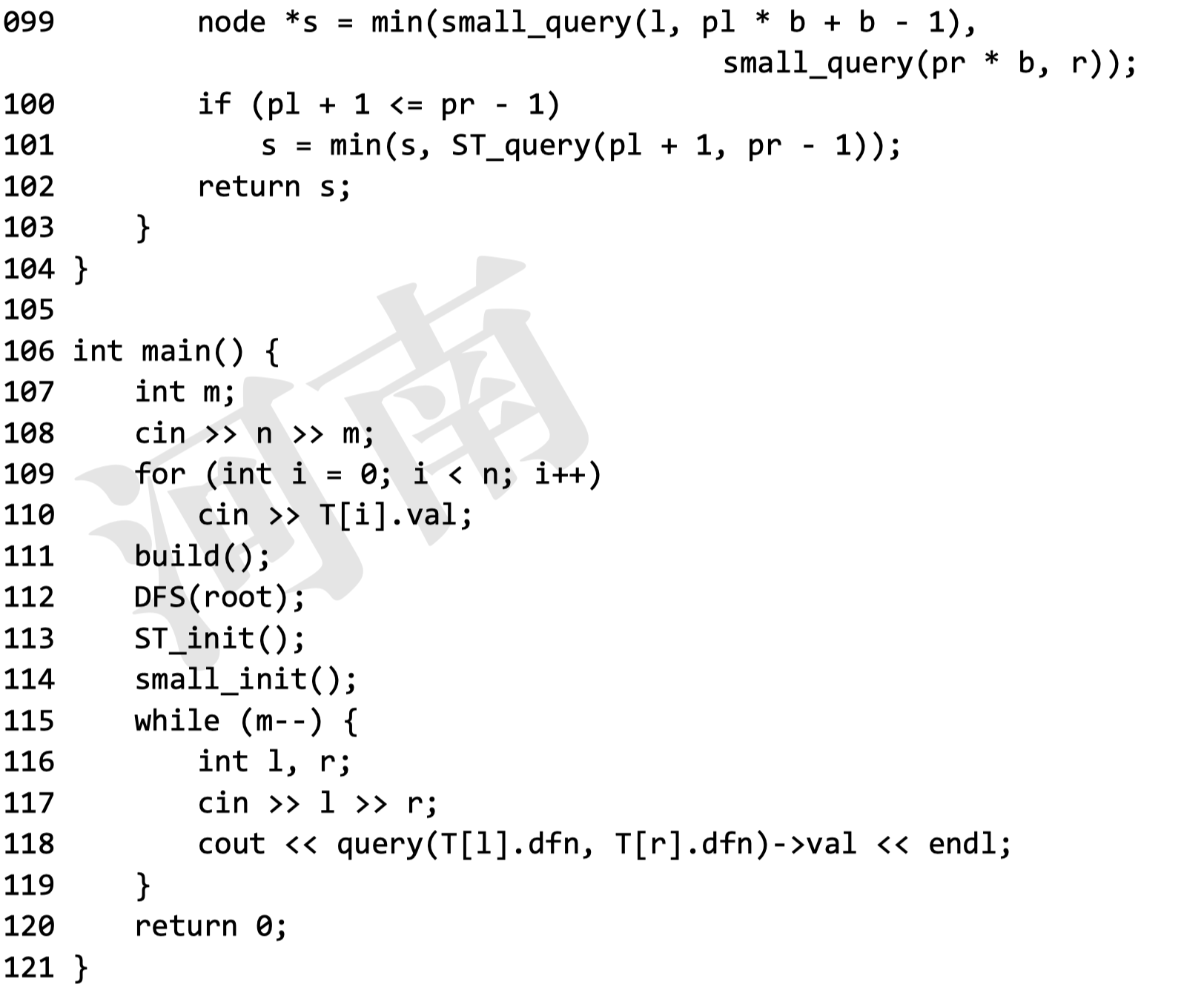 •设t为Euler序列长度。取b=ceil(log2(t)/2)。将序列每b个分为一大块,使用ST表(倍增表)处理大块间的RMQ问题,复杂度O(t/b*log(t))=O(n)。