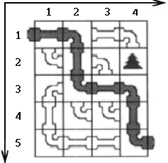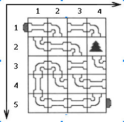 每种管道将占据一个单位正方形土地。你现在可以旋转这些管道,使其构成一个管道系统,即创造一条从(1,1)到(n,m)的连通管道。标有树木的方格表示这里没有管道。如下图表示一个 5*4 的土地中(2,4)处有一颗树木。
