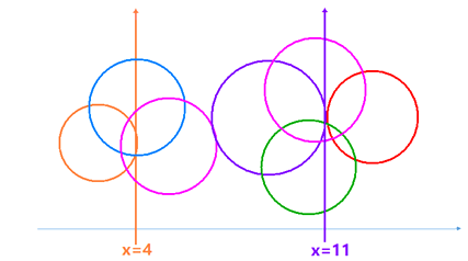 嘉年华游园会上有"射箭击气球"的项目。是在一个高平台上,前后左右用绳线系着大小不同的气球,让游客们用箭去射。对于每个气球,提供输入的是水平方向上气球直径的左端和右端坐标。布置气球时调整好了绳线长度,使得气球圆心位置的高度是一致的,所以纵坐标并不重要,因此只要知道左端和右端的横坐标就足够了。