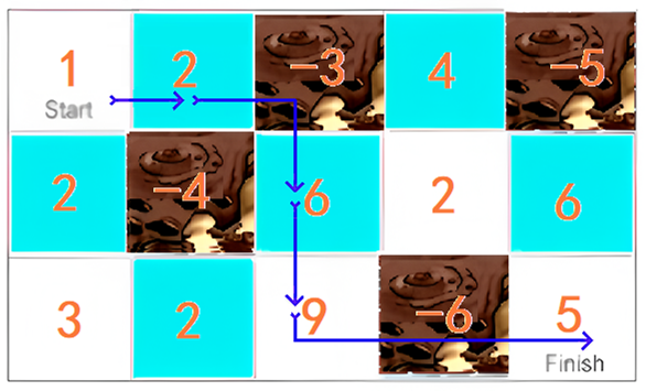 返回机器人到达“Finish”路径上可以获得的最大能量数 。注意:机器人的能量值是可以为负数的。