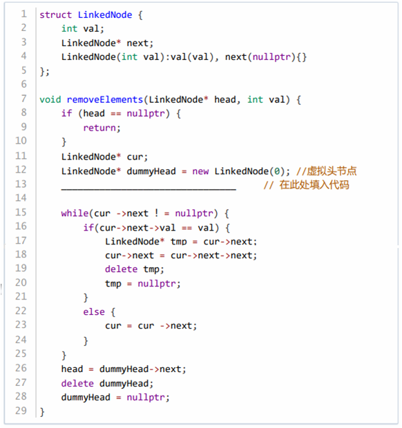 第 4 题 为了方便链表的增删操作,一些算法生成一个虚拟头节点,方便统一删除头节点和其他节点。下面代码实现了删除链表中值为 val 的节点,下面代码的横线上应填的最佳代码是( )。