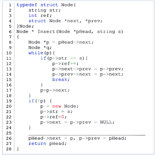 第 5 题 下图的C++代码于将字符串保存到带头节点的双向链表中,并对重复的串计数,然后将最新访问的串的节点放在链头便于查找。下面代码的横线处应填代码是( )。