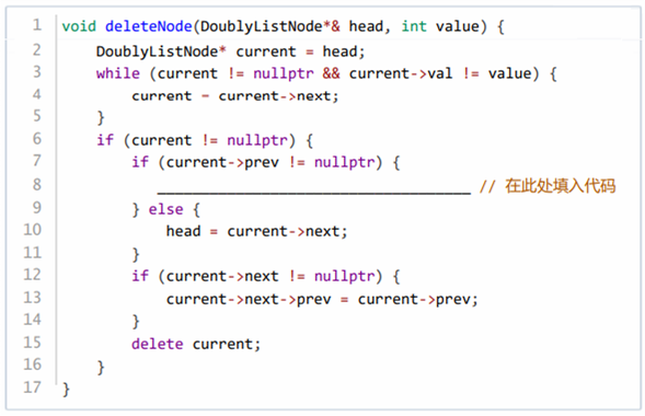 第 6 题 下面代码段是在双向链表中删除一个节点。请在横线处填( ),使其能正确实现相应功能。
